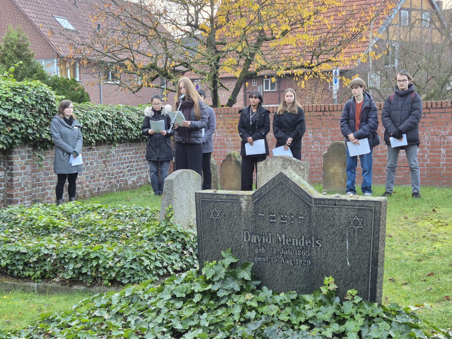 Am Sonntag nahmen Schüler:innen unseres Gymnasiums an der städtischen Gedenkfeier auf dem jüdischen Friedhof am August-Einstein-Weg teil. Anlass war der 9. November, der an die Novemberpogrome von 1938 und den Beginn der systematischen Verfolgung jüdischer Mitbürger:innen erinnert.