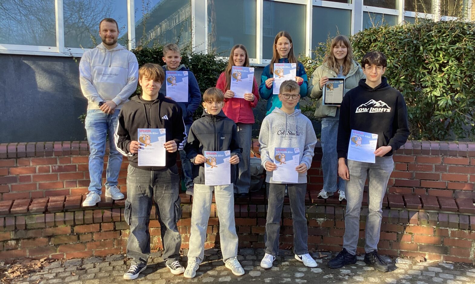 580.960 Kinder und Jugendliche aus ganz Deutschland haben am Informatik-Biber dieses Jahr teilgenommen. An unserer Schule waren es 417 Schüler*innen von der 5. Klasse bis zur Q1. Ein neuer Rekord! Besonders erfolgreich lief es dabei für einige Schüler*innen aus der Erprobungs- und Mittelstufe: in der Jahrgangsstufe 6 konnten Fabian F. (6D), Marie G. (6B), Leo H. (6E) und David H. (6B) einen tollen 2. Preis erreichen. Mara R. (7C) holte sogar den 1. Preis in ihrer Alterstufe. Charlotte B. (7C), Petar K. (10E) und Alexander Leon Z. (10E) durften sich ebenfalls über einen 2. Preis freuen.